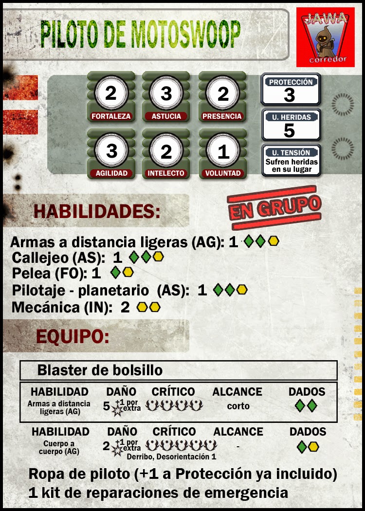 1 ÉXITO: Hay multitud de torneos y agrupaciones que patrocinan sus propias carreras de Swoop. La carrera de Mos Motta está bajo el control de los Hutt, y está considerada ilegal por las autoridades imperiales, quienes por otra parte, la ignoran plenamente, al realizarse la competición en mundos fronterizos de poca importancia.